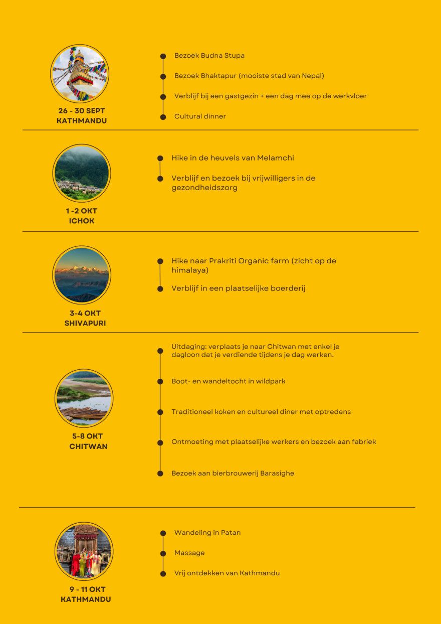 Bij wie kom je terecht? Altijd leden van de vakbond, variërend van leraren tot artsen, arbeiders in steen- of kledingsfabrieken of straatverkopers. Je gaat ook met hen een dag mee de werkvloer op zodat je de werkomstandigheden van dichtbij kan ervaren. Je krijgt hiervoor ook het dagloon dat een werker in Nepal krijgtDaarna verlaten we Kathmandu en trekken we de Nepalese heuvels in naar Melamchi, dichtbij de grens met Tibet, waar we het avontuur opzoeken met uitdagende hikes en ontmoetingen met gezondheidswerkers. Jammer genoeg is de tijd te kort voor een echte meerdaagse trektocht, maar we wandelen samen door de rijstvelden en de bloeiende rododendrons met uitzicht op de Himalaya. Zo geraken we tot bij andere gemeenschappen waar we gezondheidscentra bezoeken en praten over hoe de bevolking aan een pensioen geraakt of wat ze moeten doen als ze ziek vallen. We trekken na deze dagen in heuvels te voet terug naar Kathmandu.